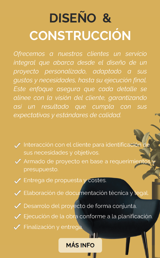 Ofrecemos a nuestros clientes un servicio integral que abarca desde el diseño de un proyecto personalizado, adaptado a sus gustos y necesidades, hasta su ejecución final. Este enfoque asegura que cada detalle se alinee con la visión del cliente, garantizando así un resultado que cumpla con sus expectativas y estándares de calidad.