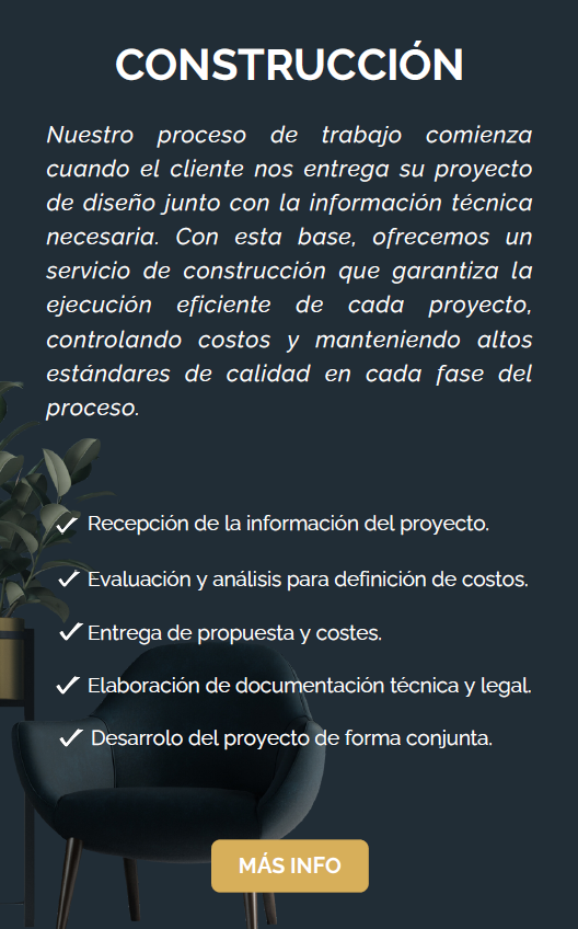 Nuestro proceso de trabajo comienza cuando el cliente nos entrega su proyecto de diseño junto con la información técnica necesaria. Con esta base, ofrecemos un servicio de construcción que garantiza la ejecución eficiente de cada proyecto, controlando costos y manteniendo altos estándares de calidad en cada fase del proceso.